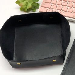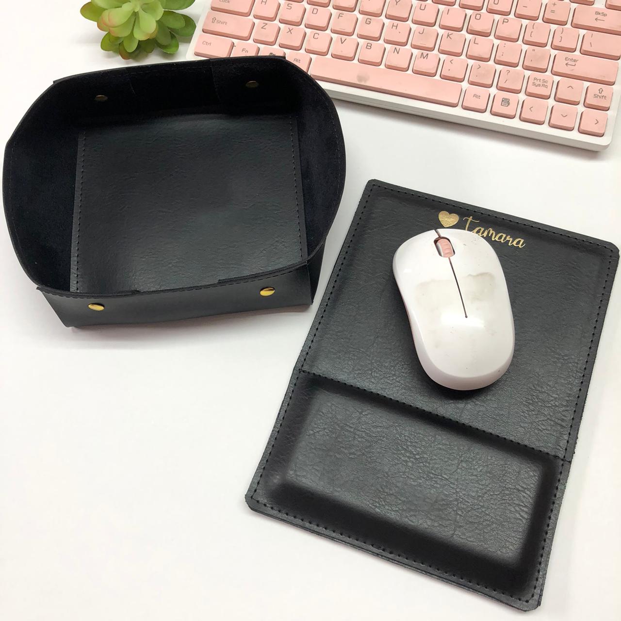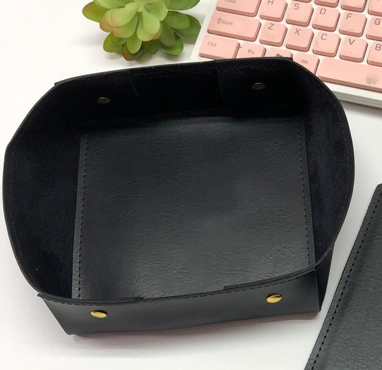 Organizador de mesa feito em material que imita couro, fino e elegante, para dar um charme no seu dia a dia.